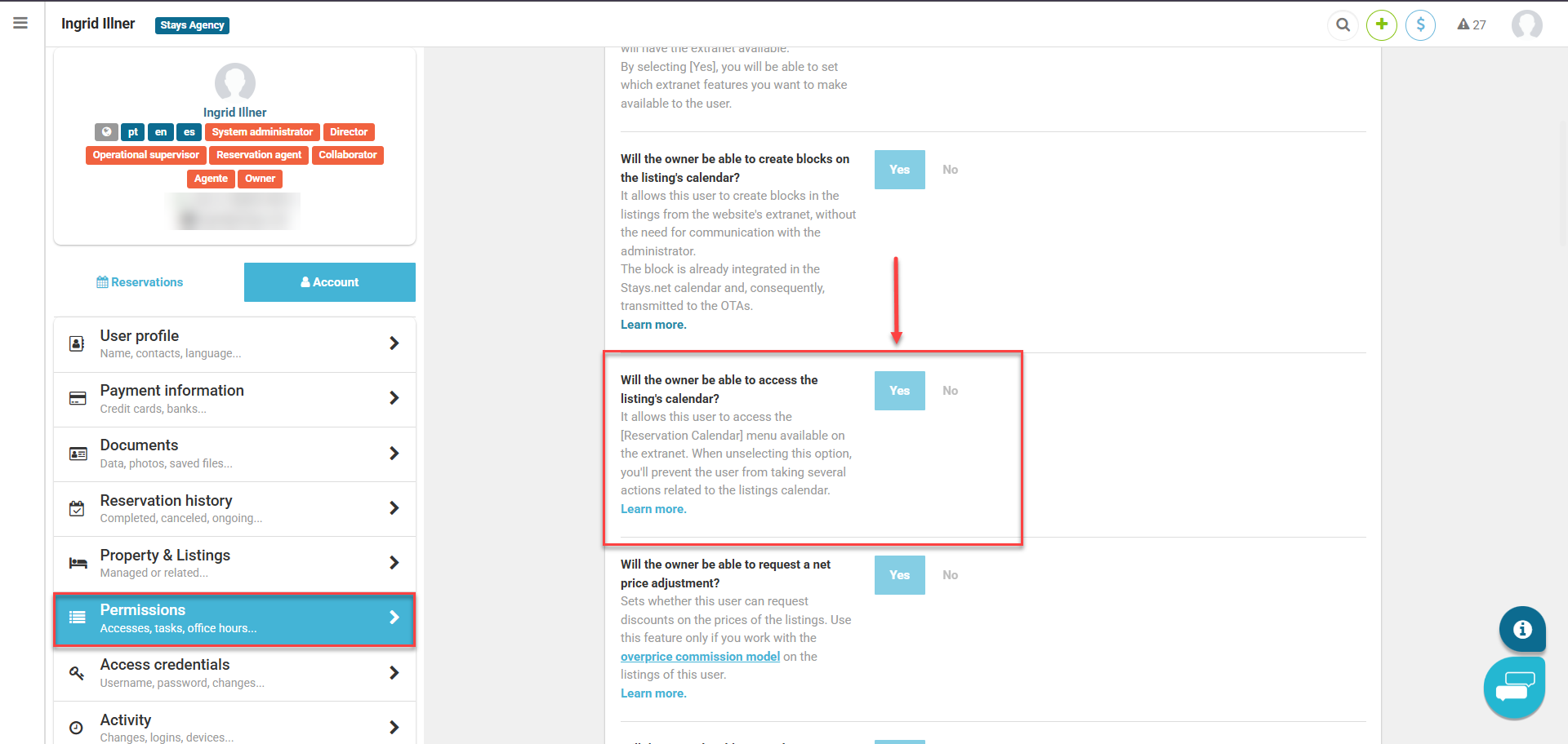Before editing the extranet settings, make sure the owner is registered, linked to the accommodations, and has the correct calendar access permissions.