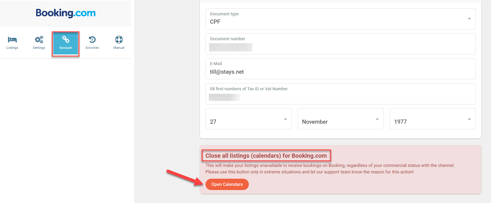 To do this emergency command, go to the [Channel Managers Dashbaord > Booking.com] menu. On the [Account] tab, go to the [Close all listings (calendars) for Booking.com] section.