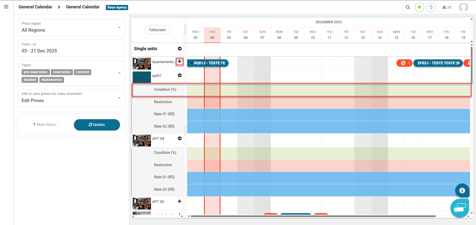 After completing the connection, you can check all prices and restrictions sent by PriceLabs in the [General Calendar]. Open the listing, click on [+] to expand the options, and access the [Condition] section.