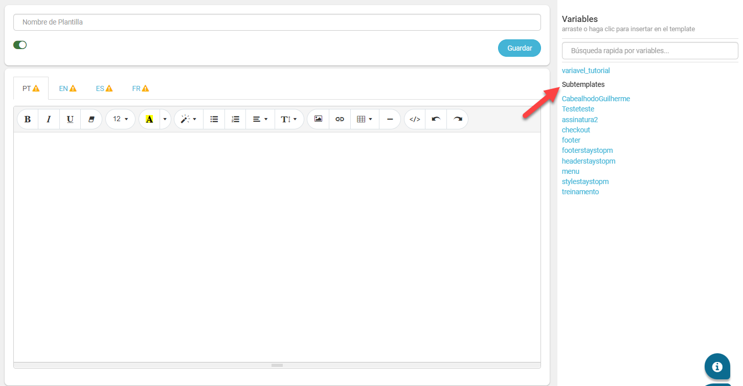 Los subtemplates se crean y gestionan en [Catálogo > Planilla de correo electrónico].