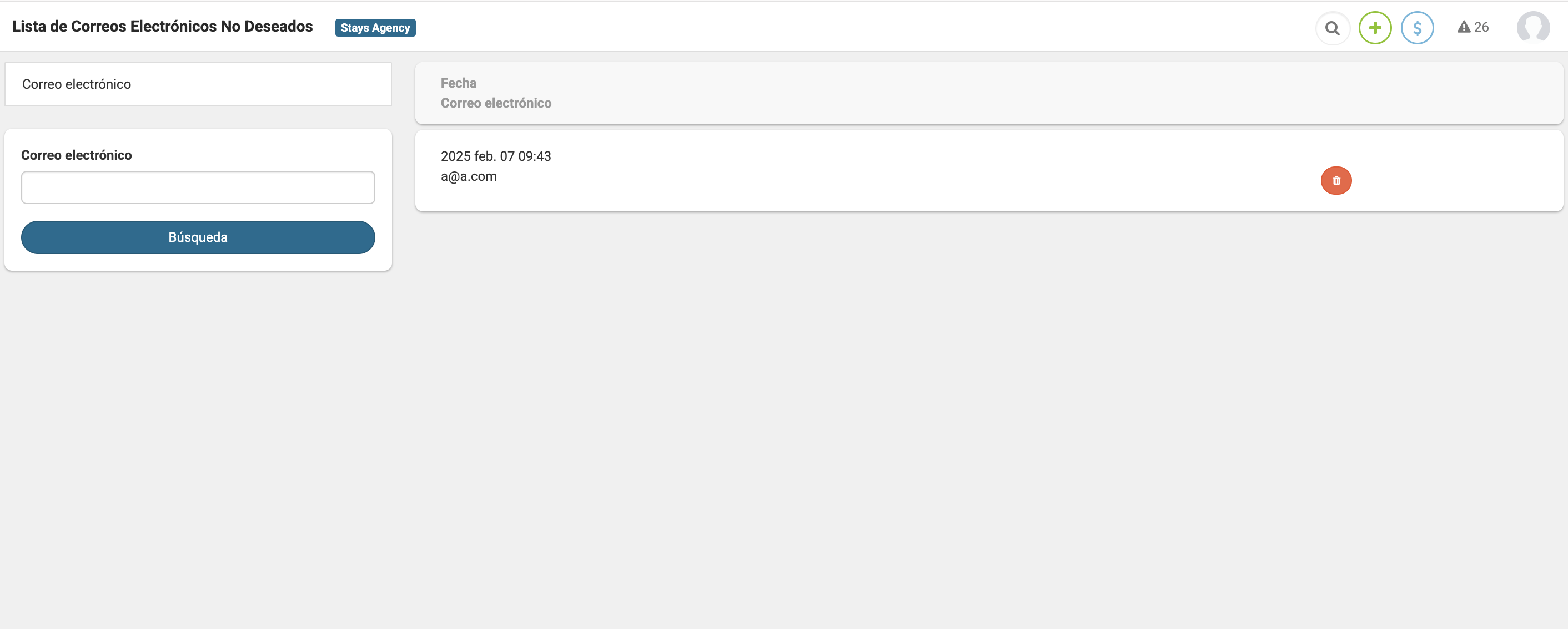 Para añadir o eliminar correos electrónicos de la Lista de correos electrónicos no deseados, accede a [Menú > Usuarios y Huéspedes > Auxiliares > Lista de correos electrónicos no deseados].