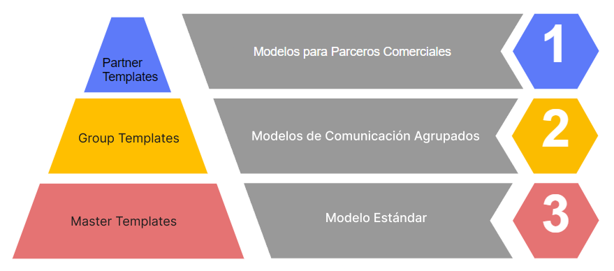 | Modelos estándar (MASTER TEMPLATES) | Nivel más básico de la jerarquía de envío. Es la última opción para enviar un determinado correo electrónico. El sistema tiene modelos predefinidos para ayudarte en la fase inicial de uso del sistema, pero recomendamos que verifiques y hagas los ajustes necesarios. |