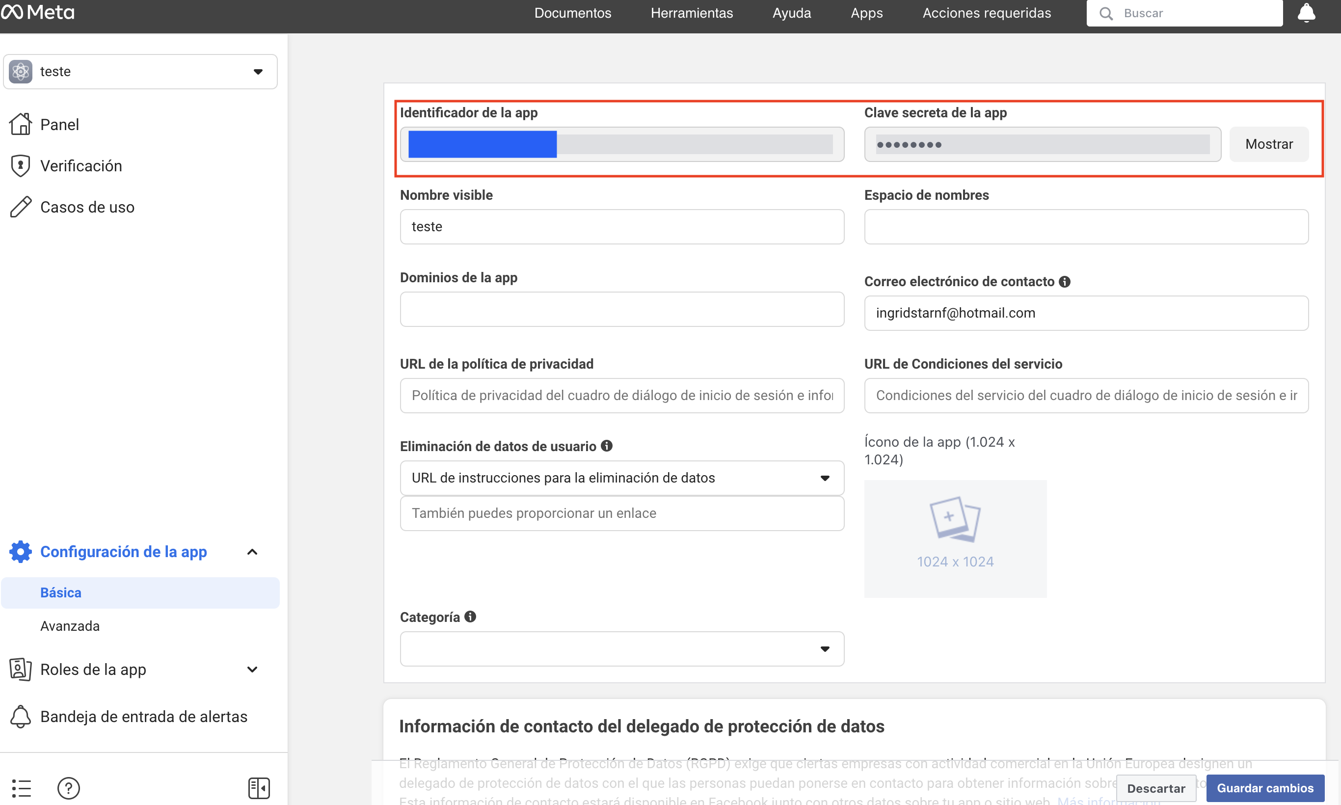 - Copia el [Identificador de la app] y la [Clave secreta de la app].