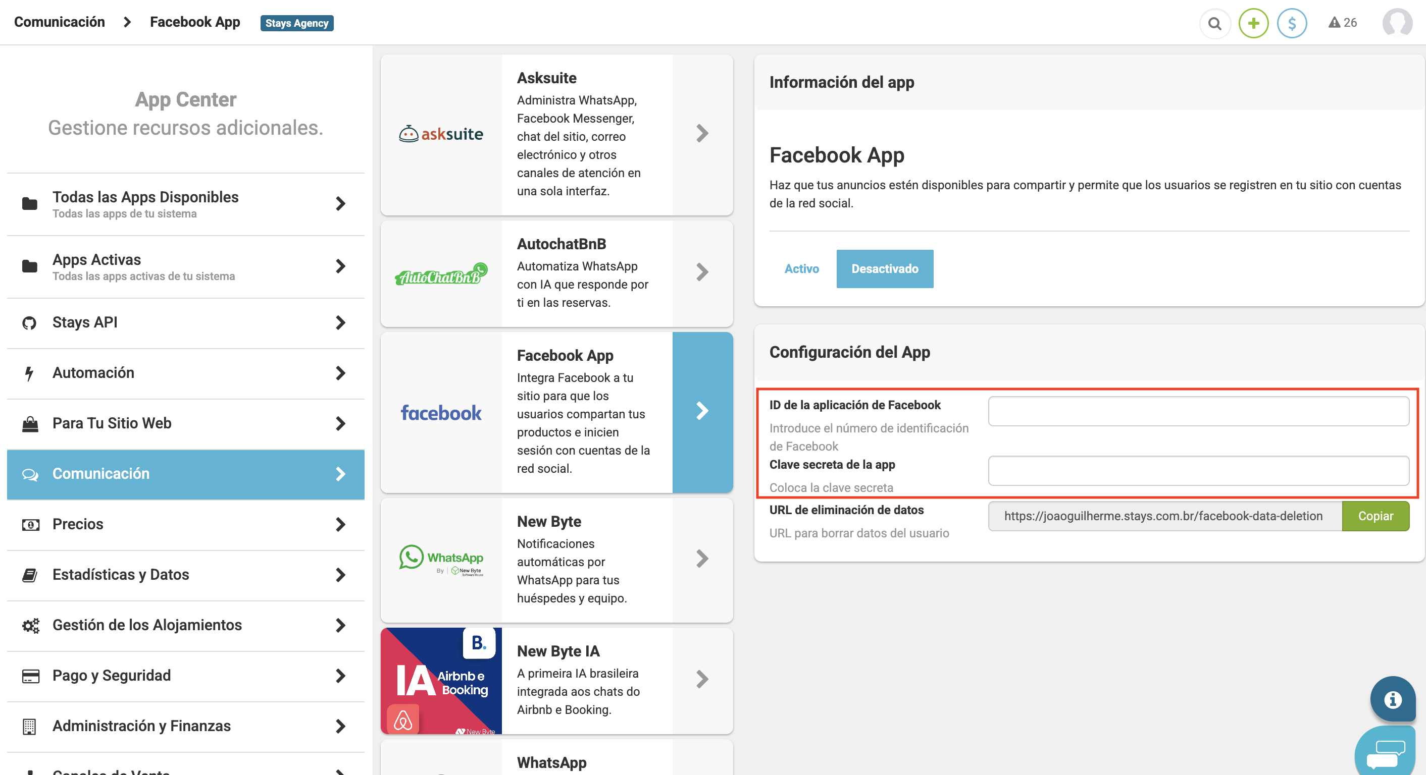 - Accede a la Stays y ve a [App Center > Comunicación > Facebook App].