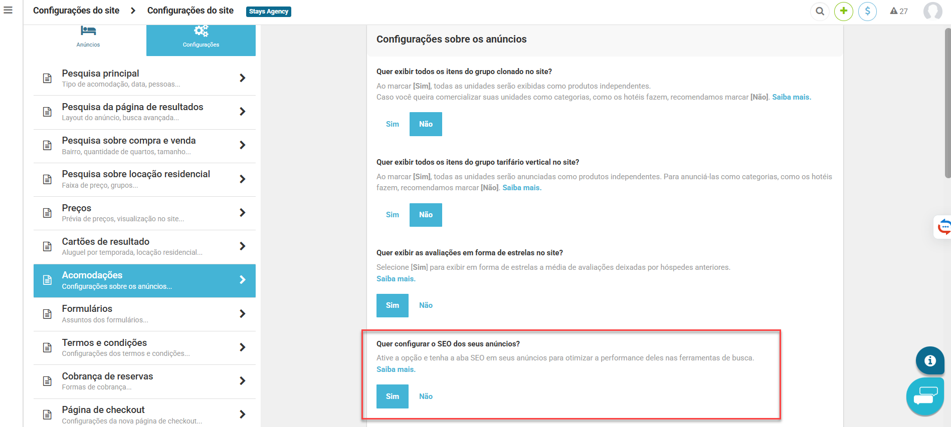 - Vá em [Gerencias Site e Templates > Configurações do site > Configurações > Acomodações];