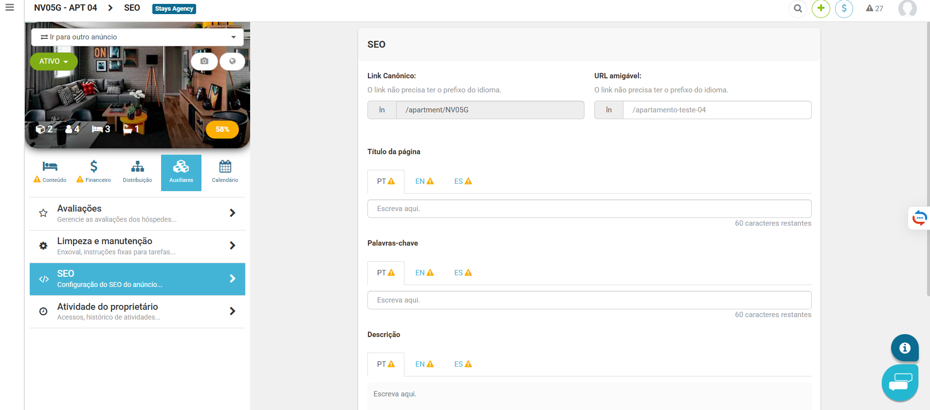 Também é possível configurar o SEO de cada anúncio do seu portfólio.