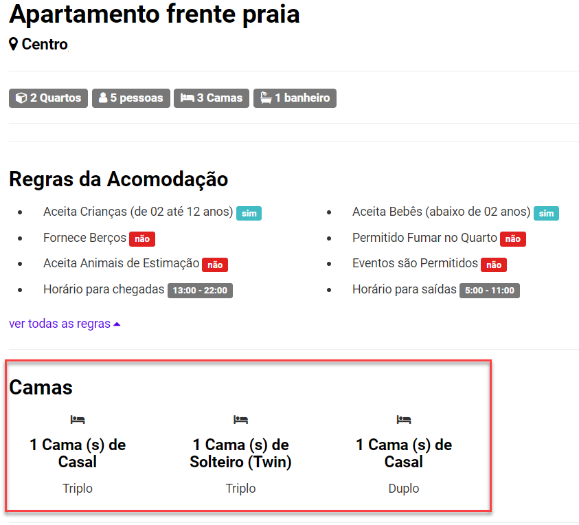 A informação de camas ficará atrelada a cada cômodo e estará na parte descritiva dos seus anúncios no seu site.