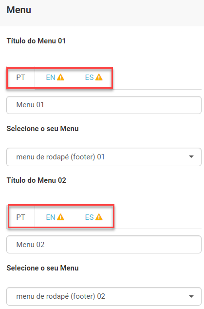 Após você já ter criado seus menus no editor de sites, é possível usá-los no rodapé também. Coloque o título em todos os idiomas ativos do seu site e escolha os menus na lista.