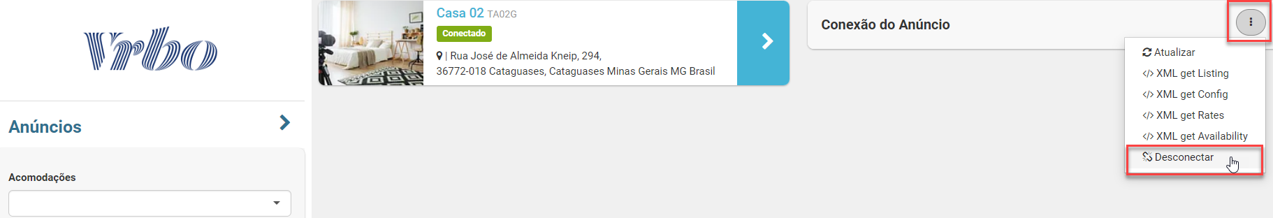 Para desconectar um anúncio Vrbo, basta ir ao menu [Dashboard de Channel Managers > API Vrbo] na aba [Anúncios].