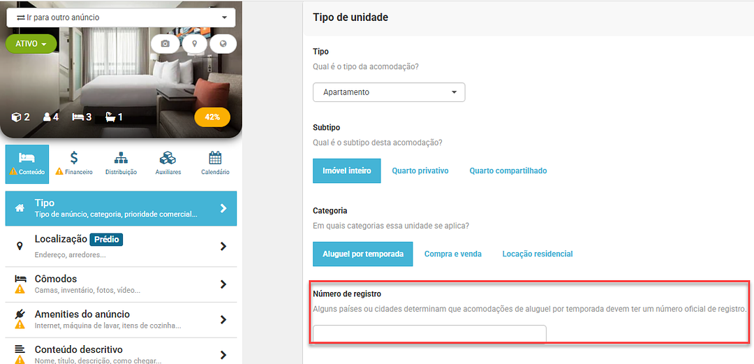 Importante: o Airbnb não recebe essa informação pela API. Se o anúncio exigir número de registro, você precisa inserir diretamente na plataforma do Airbnb. Saiba mais.