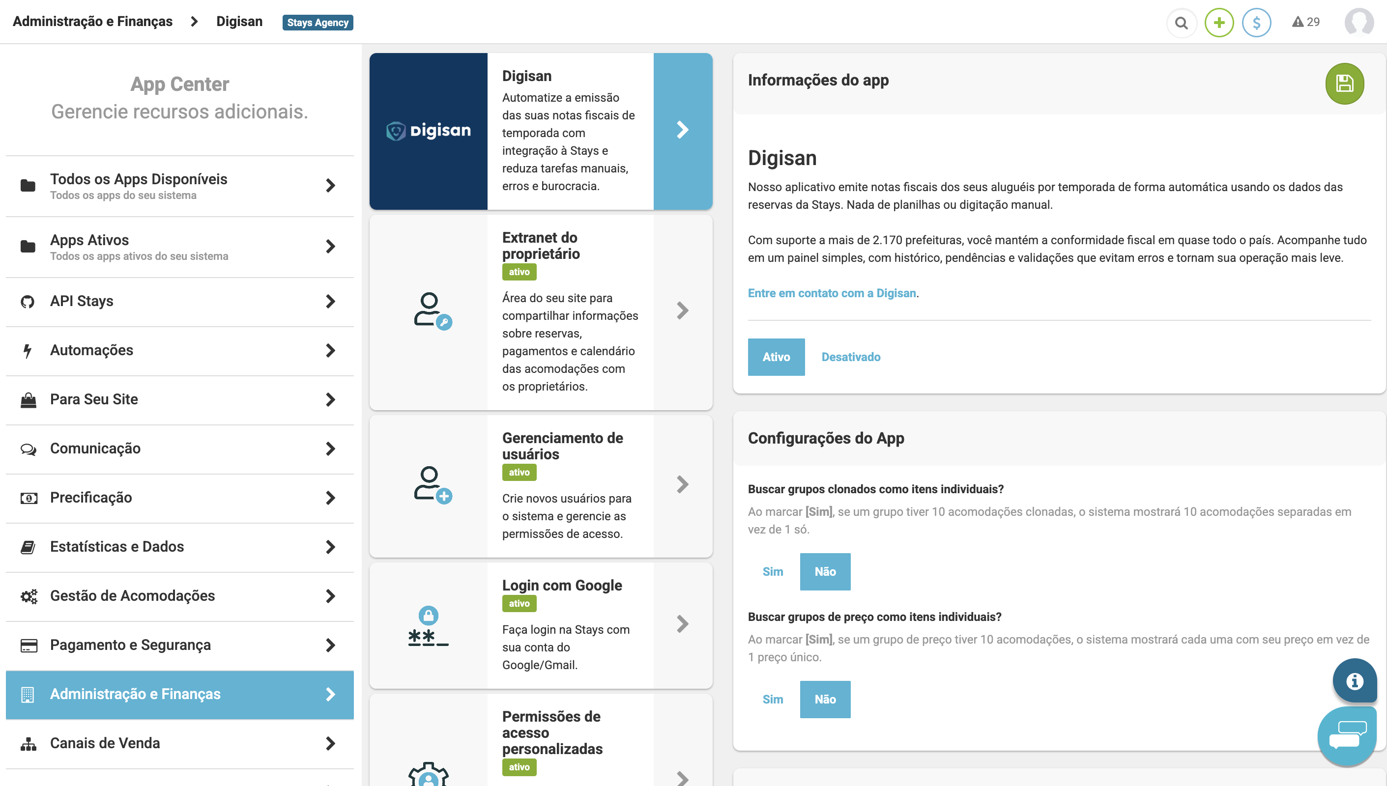 - Após o contrato feito, vá na Stays em [App Center > Administração e Finanças > Digisan];