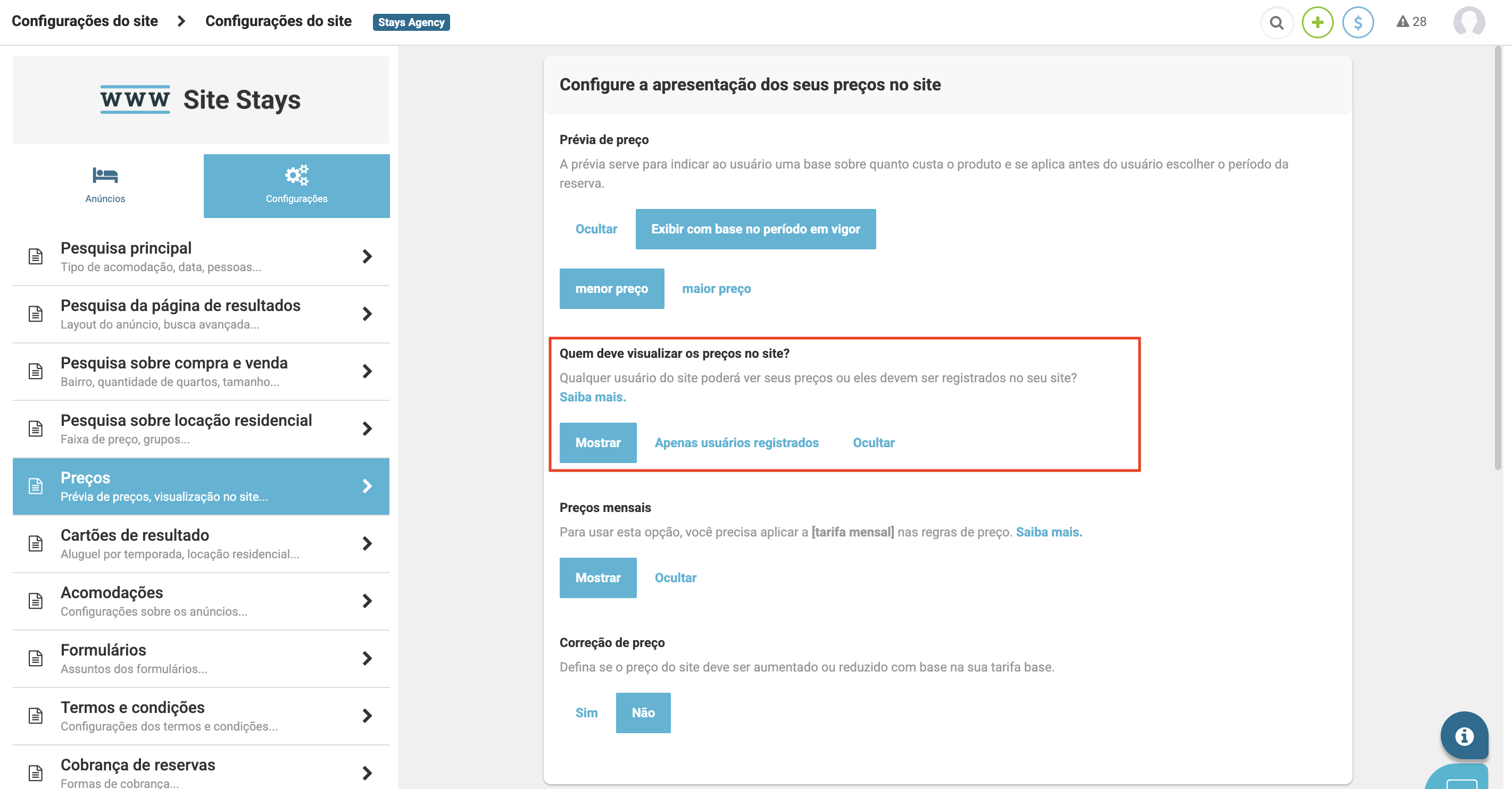 A Stays permite controlar como e para quem os preços são exibidos no site. Existem duas configurações diferentes, cada uma com um objetivo específico.